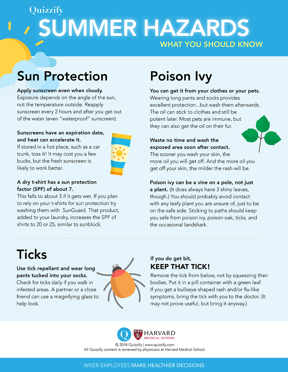 Excess sun, poison ivy and ticks are three of the most common threats to summer fun... and to employee health. To help your employees deal with these obstacles, we are pleased to bring you our 2018 Summer Hazards curriculum. Our unique Summer Hazards quiz will help prep your employees for months of outdoor activities. This Summer Hazards "cheat sheet" will help raise awareness about the quiz and these issues. Feel free to distribute and post in break rooms or other common areas.